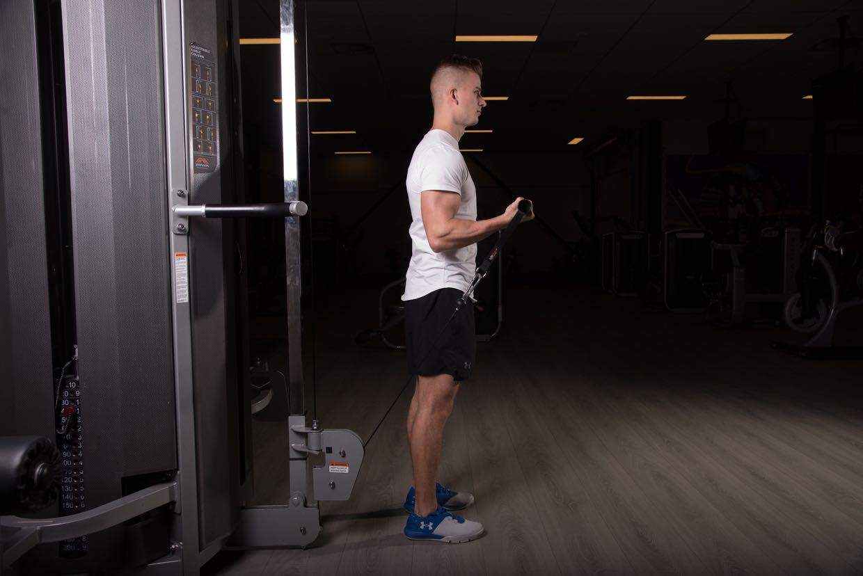 Wanneer de kabel te ver omhoog gebracht wordt, verlies je de spanning uit de biceps wat ten koste gaat van de effectiviteit.