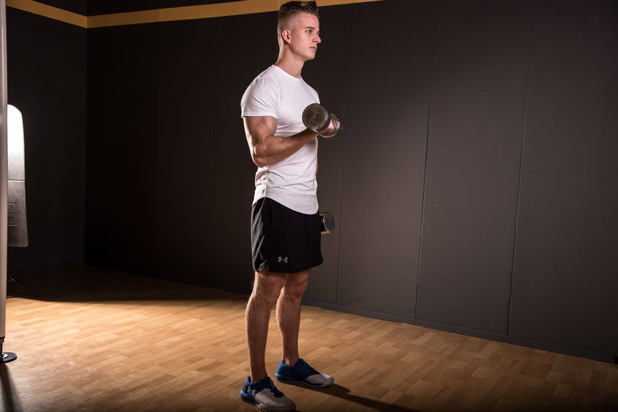 De dumbell bicep curl is misschien wel één van de populairste oefeningen voor de biceps. Dat is niet geheel onterecht. De dumbell bicep curl kan op verschillende manieren worden uitgevoerd. Het verschil tussen zittende uitvoering of staand bijvoorbeeld. Staand zullen de core-spieren meer moeten werken om te stabiliseren. Staande uitvoering maakt het ook makkelijker om te ‘smokkelen’ door het bovenlichaam in de opwaartse beweging naar achteren te gooien.