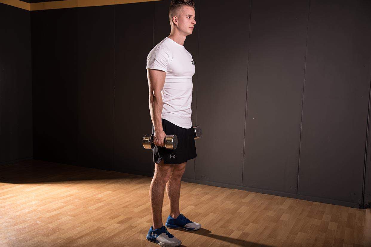 - Houdt de dumbells naast je zij in neutrale positie (palmen naar je toe gericht, duimen naar voren)