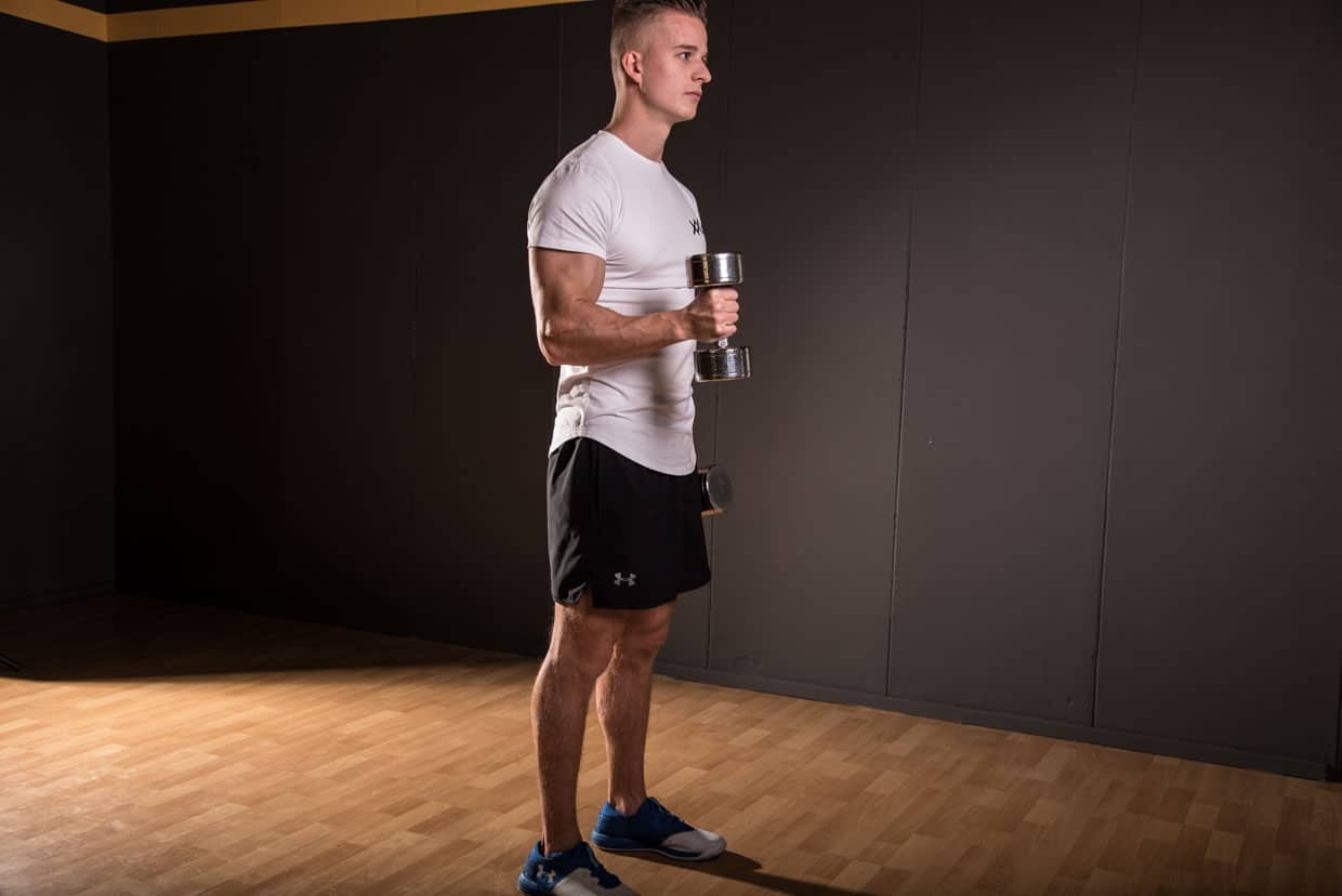 - Houd de dumbells naast je zij in neutrale positie (palmen naar je toe gericht, duimen naar voren)