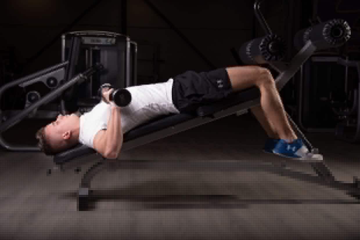 Een decline bankje (schuin omlaag) verhoogt juist de inzet van de onderste vezels van de borstspieren terwijl terwijl het bovenste deel minder hard hoeft te werken. Deze onderste vezels vormen ongeveer 2/3 van het oppervlak van de borst.