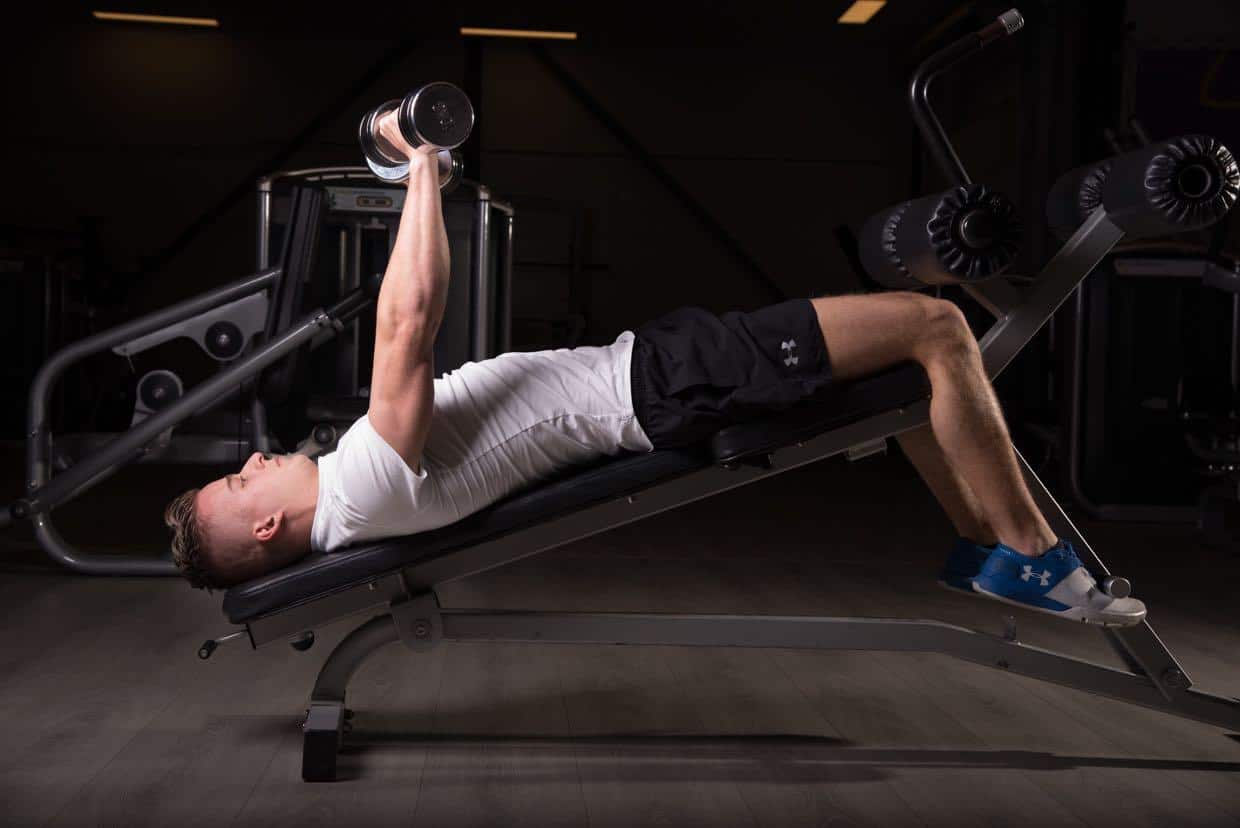 De decline positie kan even wennen zijn. Vooral op het moment dat je de armen (bijna) strekt en je deze in dezelfde lijn omhoog brengt als op een plat bankje. Door de gekantelde houding zal de zwaartekracht de dumbells niet alleen omlaag, maar ook naar achteren trekken. De (bijna) gestrekte armen moeten haaks op de vloer staan, niet haaks op de romp. Richt deze dus meer richting de buik dan richting de borst.