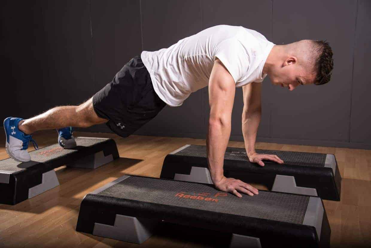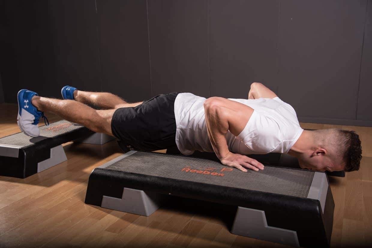 In deze variatie gebruik je twee verhogingen waartussen je jezelf tussen kunt laten zakken. Dit zorgt ervoor dat de bewegingsbaan van de oefening iets groter wordt.