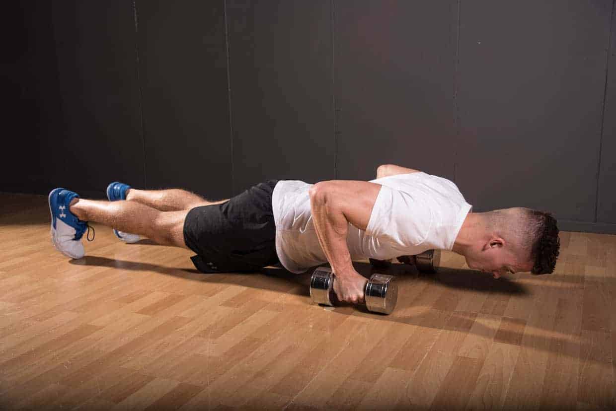 - Neem een plank positie aan met gestrekte armen steunend op dumbells. Gevoelsmatig kan dit betekenen dat je de billen wat hoger moet doen dan je zou denken. Controleer deze stand eventueel met behulp van een spiegel.