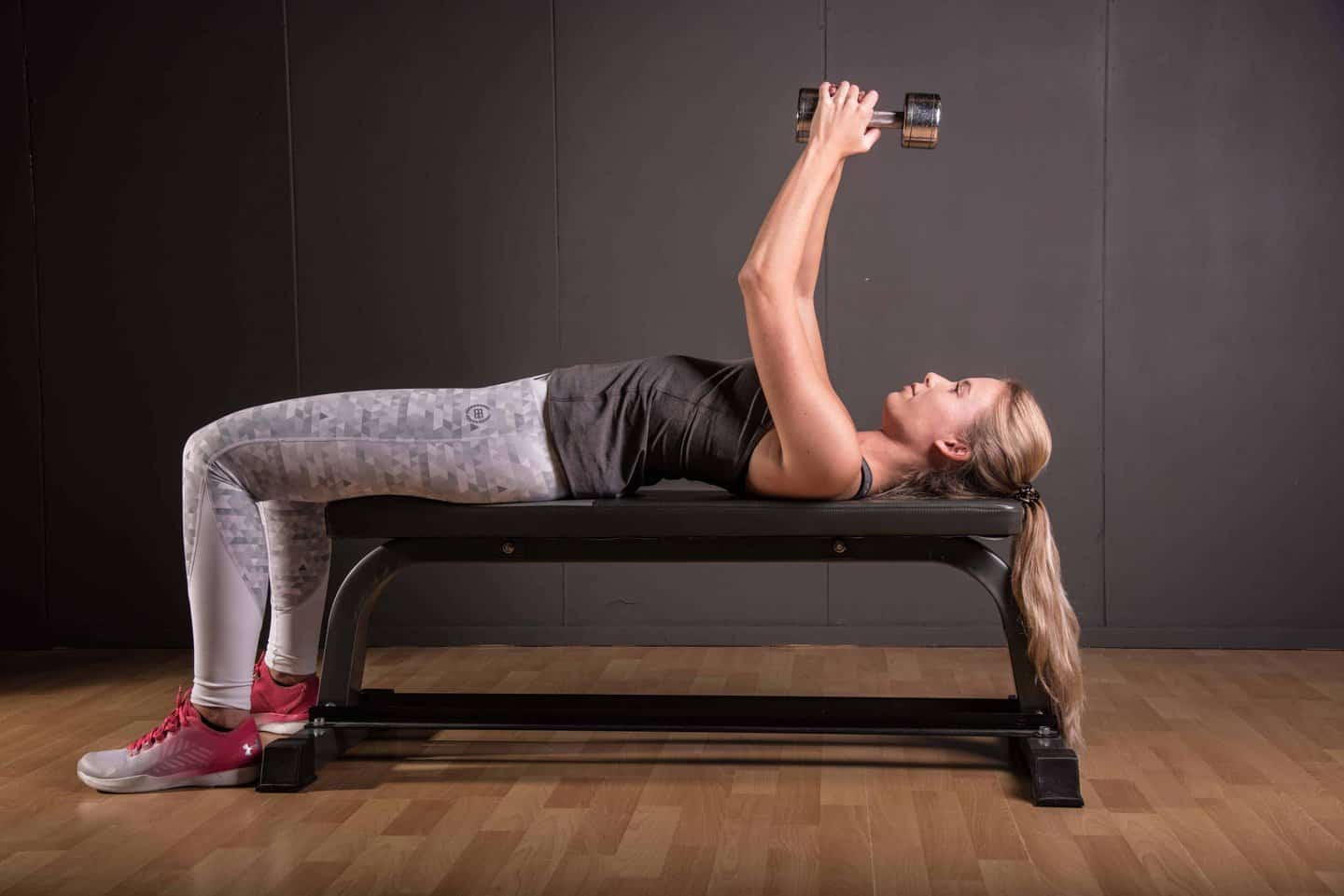 2. Breng de dumbell naar achteren door je bovenarmen richting je oren te brengen tot je een volle rek voelt op de grote rugspier.