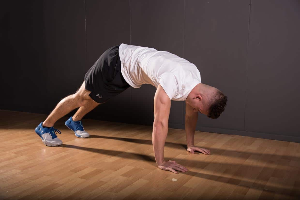 Hoewel lichter dan een handstand push up is de pike push up een stuk zwaarder dan normaal opdrukken. Begin daarom vanuit een normale push up waarbij je de afstand tussen handen en voeten in kleine stappen vergroot. Zorg ook voor een zacht oppervlak of een kussen.