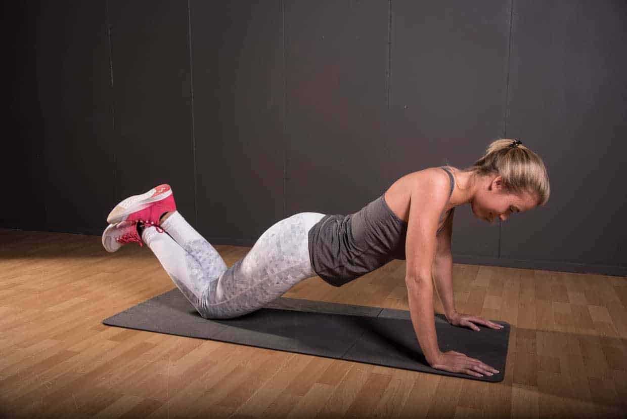 De uitvoering op de knieën is een lichtere variant van de normale push up. Niet alleen heeft het bovenlichaam minder gewicht te verplaatsen, ook het stabiliseren kost minder energie.