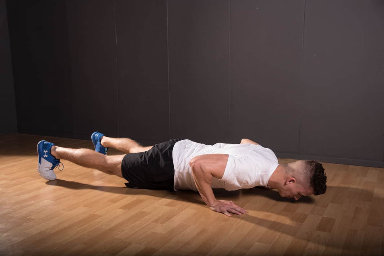 - Laat je gecontroleerd zakken door de armen te buigen waarbij de ellebogen naar achteren gaan. Blijf vlak boven de vloer hangen.