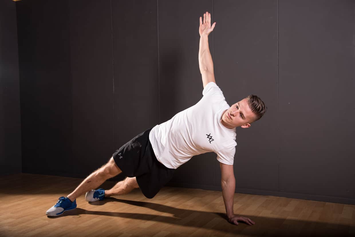 Een plank op zijn zijde is niet bepaald stabiel. De schouder van de arm die op de grond steunt, moet dan ook hard werken om de balans te bewaren. Dit is vooral een functie van de spieren die het schoudergewricht stabiliseren, de vier spieren van de zogenaamde rotatoren manchet.