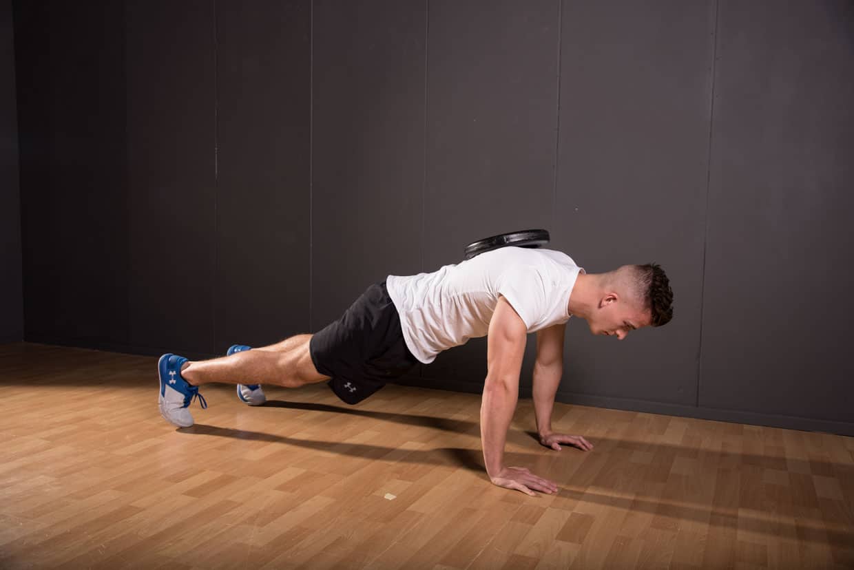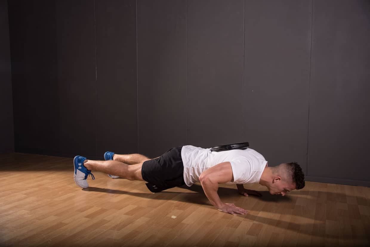 Het is mogelijk de push up zwaarder te maken met extra gewicht als je lichaamsgewicht juist te weinig weerstand biedt. Een schijf op de schouderbladen heeft echter de neiging om te verschuiven. Je hebt bovendien hulp nodig om in positie te komen. In theorie kan het voordelen (ten opzichte van bankdrukken) bieden, maar de praktijk is vaak lastig.