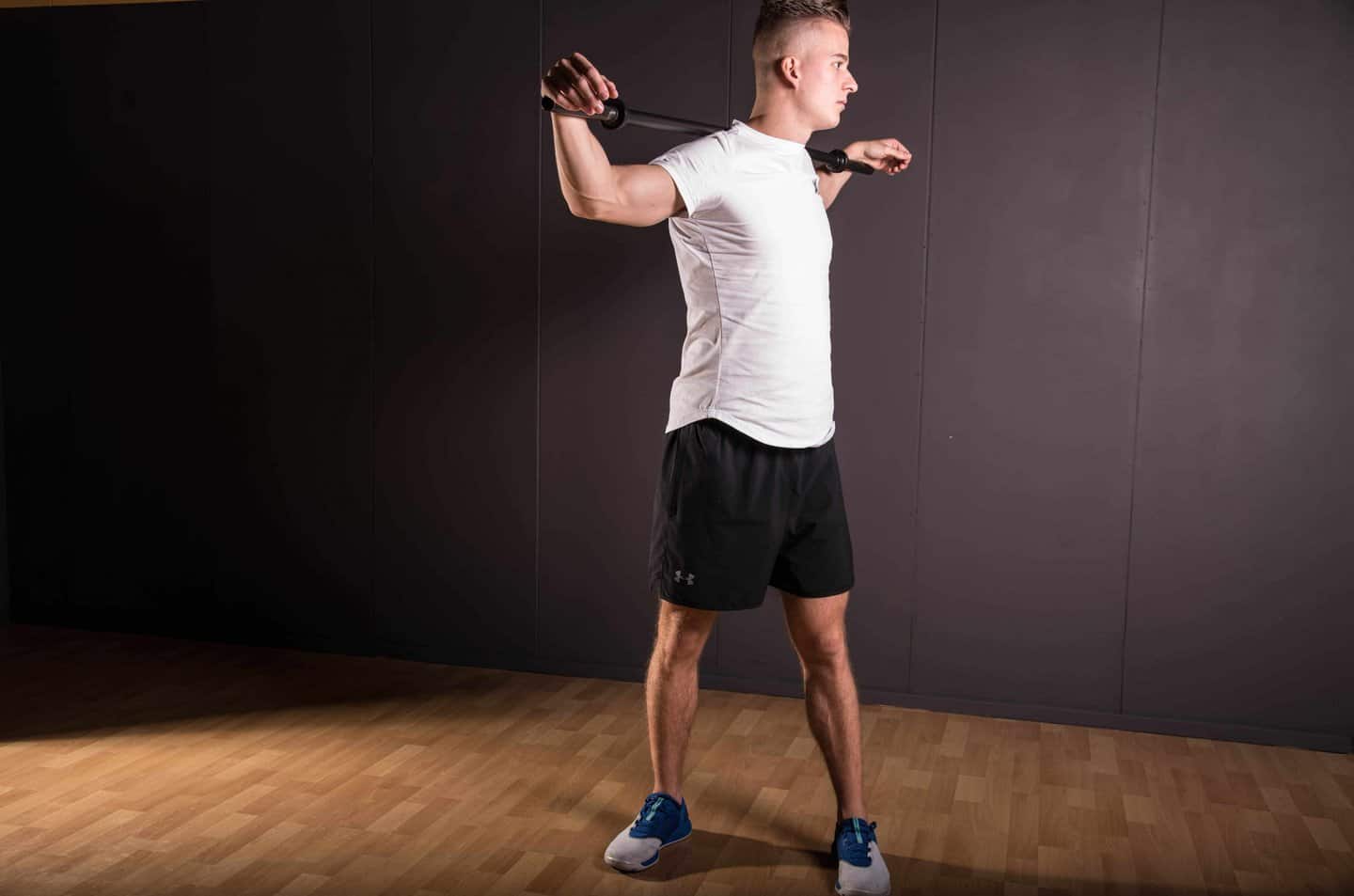 - Plaats een halter achter in de nek op een punt waar deze op de schouderbladen rust.