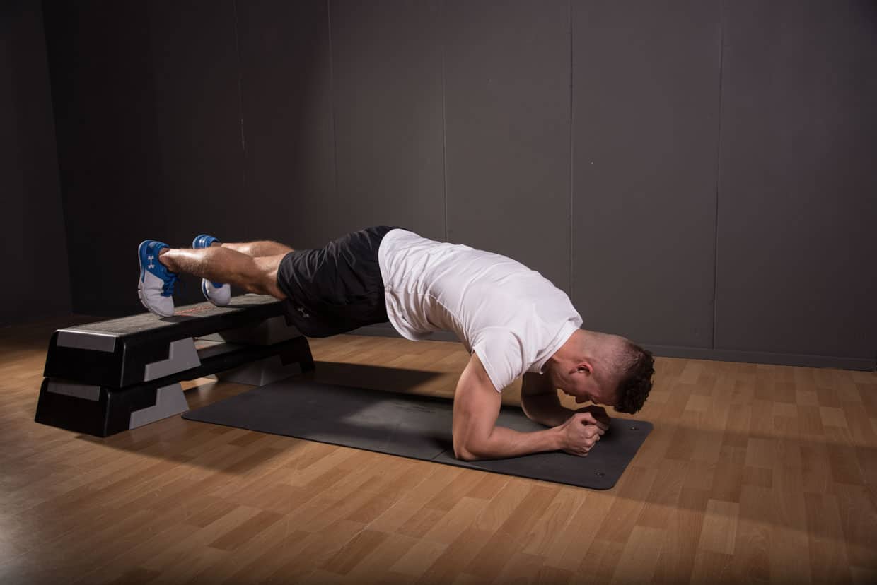 Zoek een verhoging voor de voeten (ongeveer even hoog als dat de bovenarmen lang zijn). Ga op handen en knieën zitten en plaats een voor een de voeten met de tenen op de verhoging. Plaats de onderarmen met gebalde vuisten op schouderbreedte op de grond. Duw je middel nu omhoog tot benen en rug zijn uitgelijnd met een natuurlijk kromming van de rug. Maak de rug dus niet overdreven hol of bol.