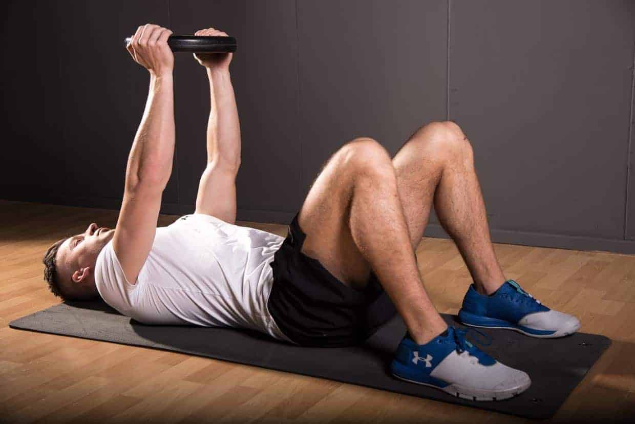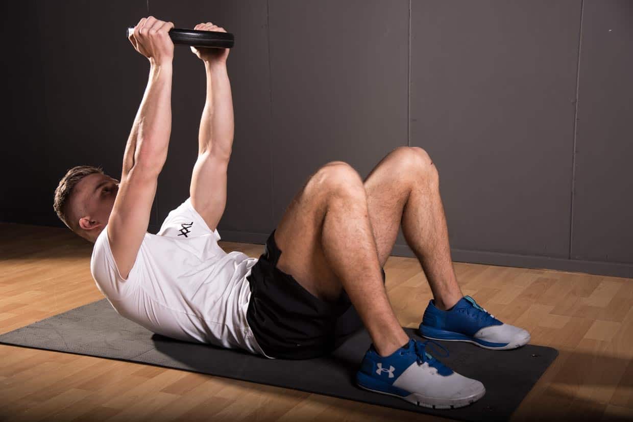 In deze variant voeg je extra gewicht toe door een schijf vast te houden met gestrekte armen. Dit vereiste ook een stabiliserende inzet van de schouders.