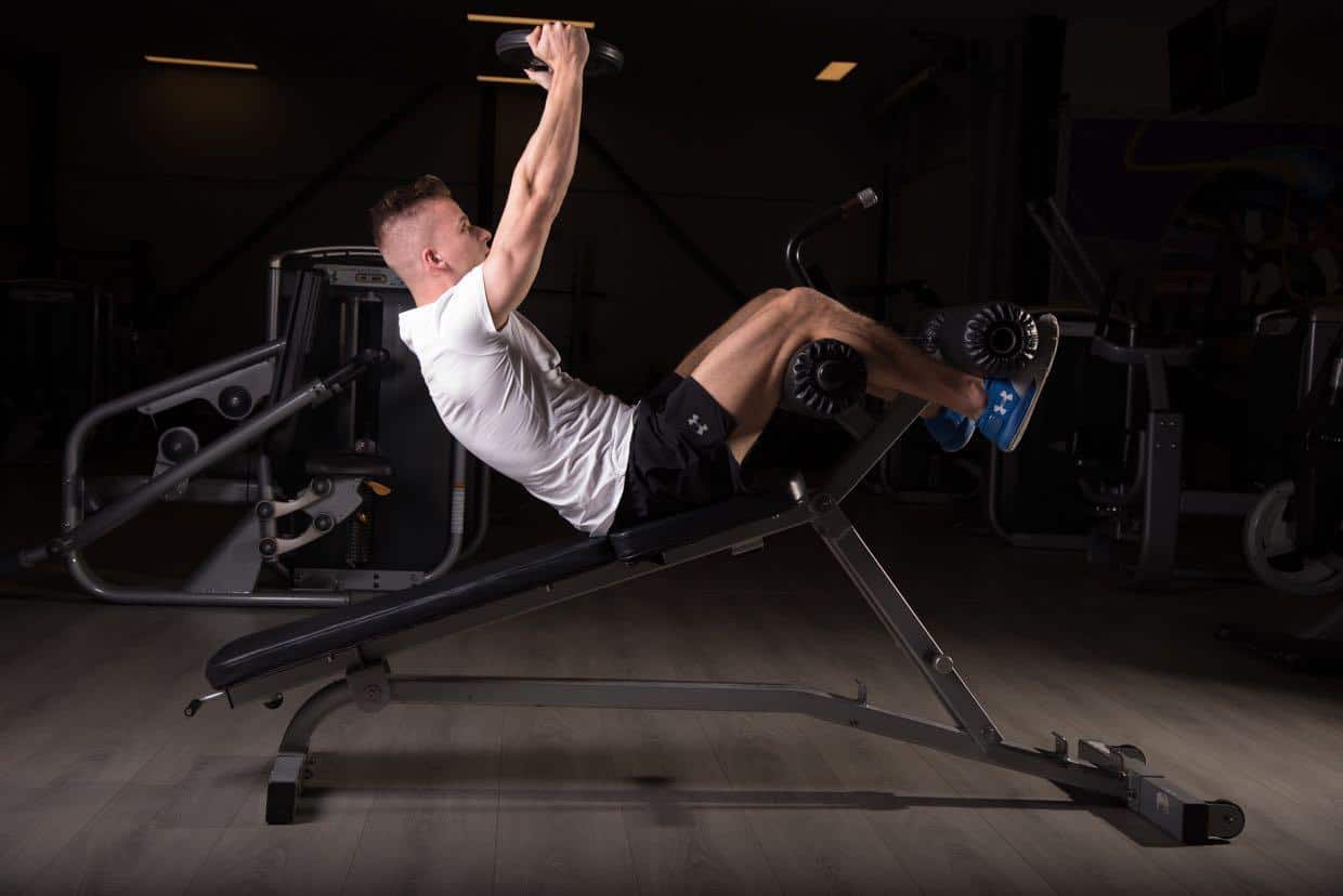 - Ga met de schijf liggen op het decline bankje en zorg dat de onderbenen stevig verankerd zijn tussen de beenkussens.
