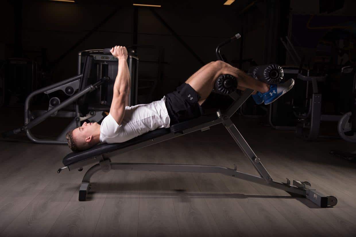- Ga met de schijf liggen op het decline bankje en zorg dat de onderbenen stevig verankerd zijn tussen de beenkussens.