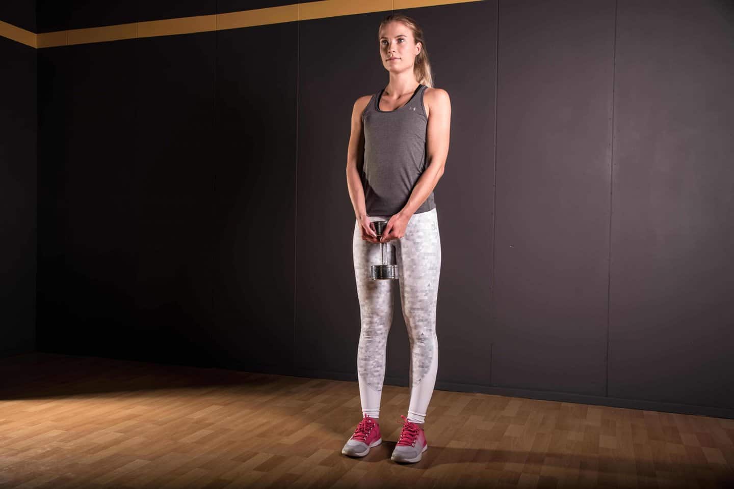 - Houd een enkele dumbell verticaal vast met beide handen aan het uiteinde.