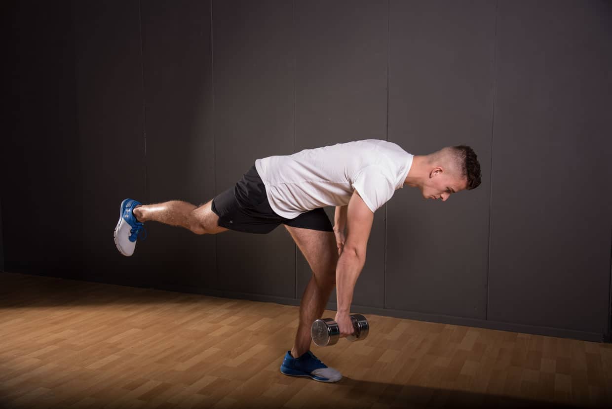 - Breng je billen naar achteren en je borst naar voren terwijl je je been naar achteren brengt (het been aan de andere kant van de hand die de dumbell vasthoudt). Maak de rug hierbij iets holler dan de natuurlijke kromming van de rug. Laat de knieën iets buigen maar niet zo ver als in een normale deadlift (ongeveer de helft).