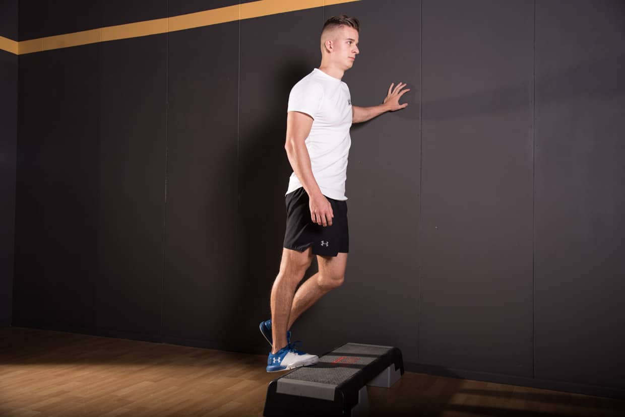 - Sta met de bal van je voet op een verhoging en zoek een punt om met je vrije hand de balans te bewaren. Het been is bijna gestrekt. Je andere voet steekt een beetje naar achteren uit.