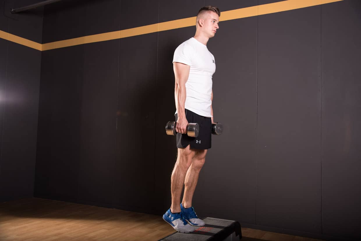 Calf raises richten zich op de twee belangrijkste spieren in de kuiten; de gastrocnemius en de dieper liggende soleus. In deze variant voer je de oefening uit op een verhoging en gebruik je dumbells voor weerstand. Deze variant op de versie die je op één been uitvoert, verschuift de nadruk van maximale krachtinspanning naar stabiliserend werk. Het is immers moeilijk je evenwicht te bewaren.