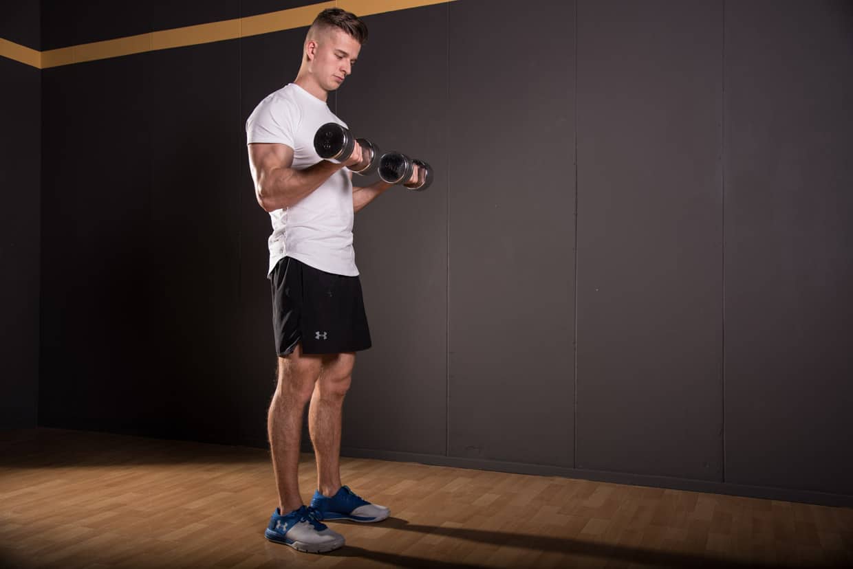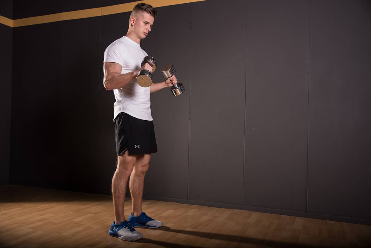 Voorkom blessures door de oefening te snel uit te voeren. Wanneer de dumbells door het momentum doordraaien terwijl je bijna het punt van volledig rekken bereikt heb, kan overstrekken/overrotatie voorkomen.