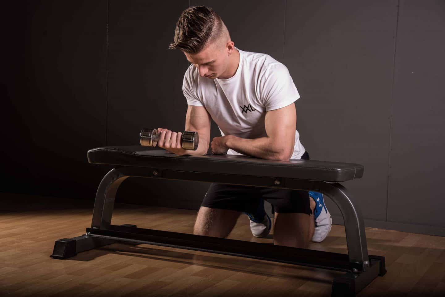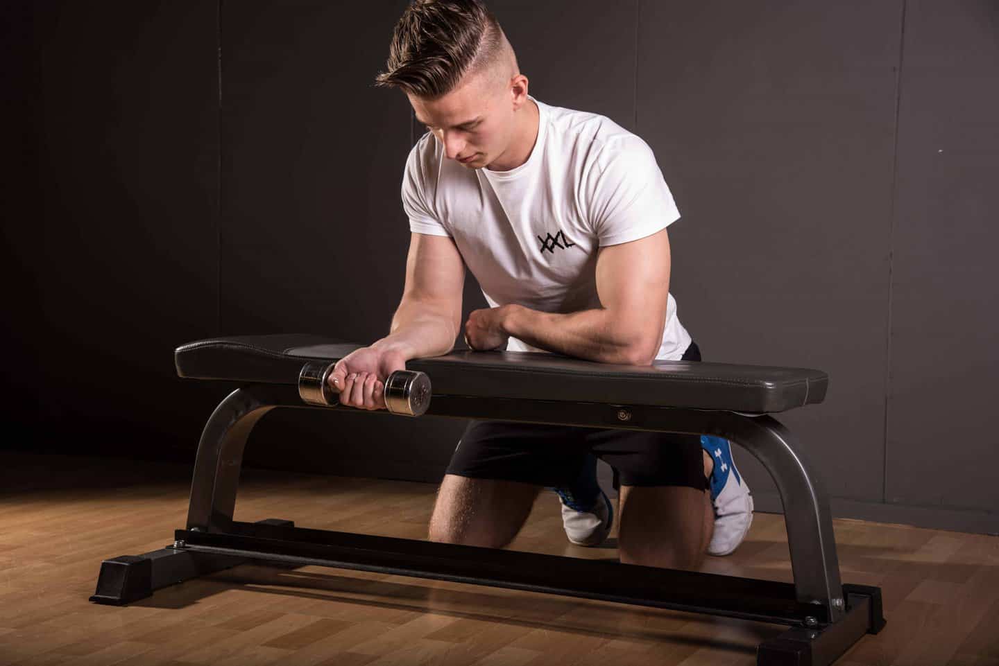 De dumbell wrist curl richt zich op de zogenaamde flexoren van de pols. De spieren aan de binnenkant van de onderarm die de pols en vingers.