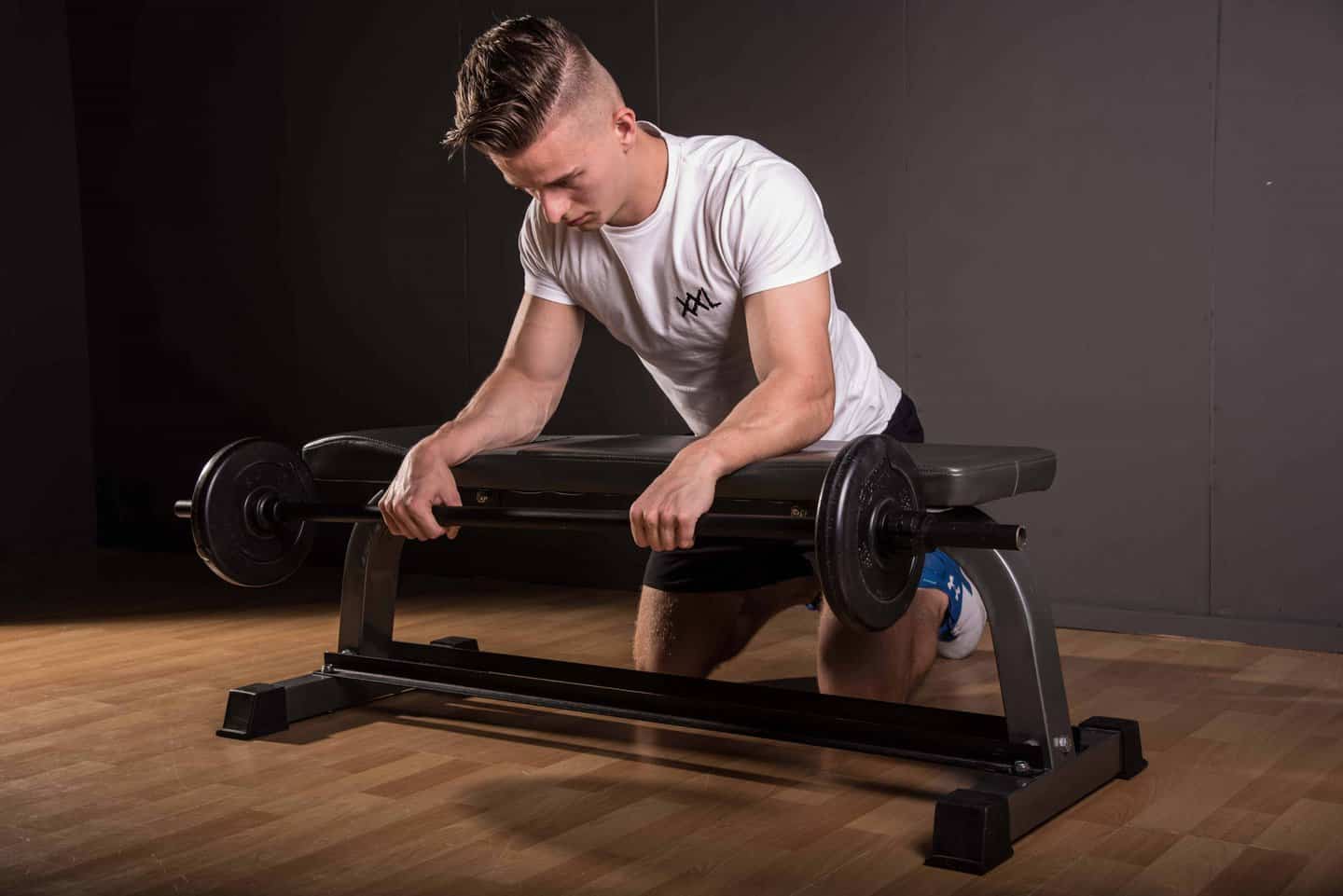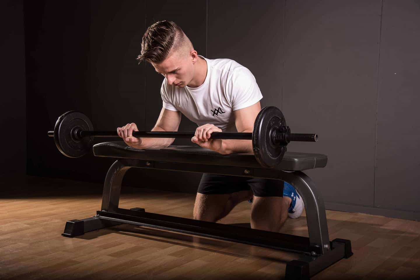 - Pak een (relatief lichte) barbell vast met de handpalmen naar achteren/beneden gericht (geproneerde greep). De handen zijn op schouderbreedte.