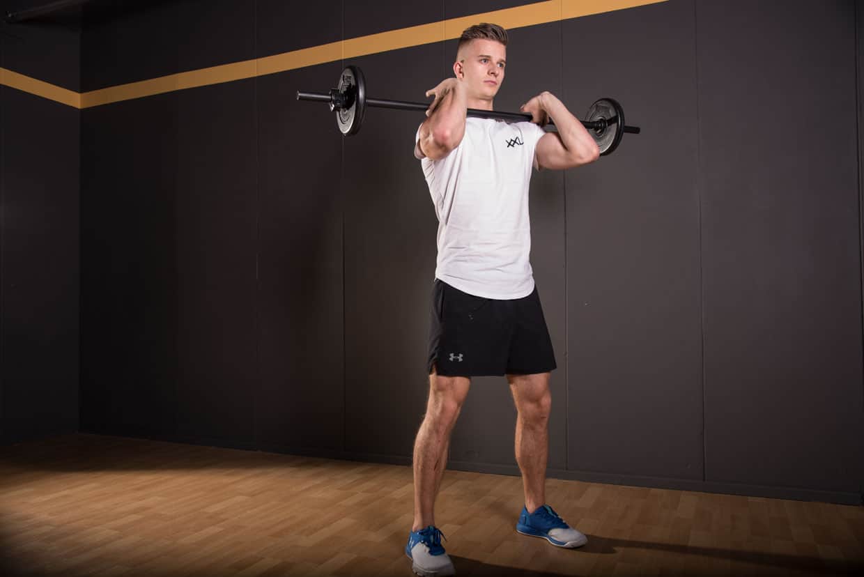 2. Sta tegen de halter en strek de armen hieronder zodat de halter op de bovenkant van de schouders komt te rusten (zie verder voor arm en handpositie).