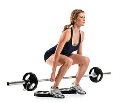 - Zak door de knieën en pak de halter vast met de palmen naar achteren gericht. Probeer de rug zo recht mogelijk te houden (met een natuurlijke kromming).