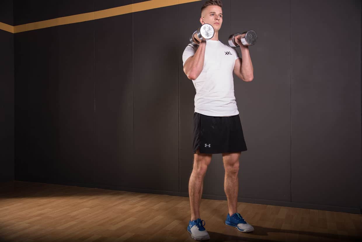 - Hou de dumbells zo dicht mogelijk tegen of op de schouders zodat deze rusten op de onderarmen (en de biceps ontzien worden).