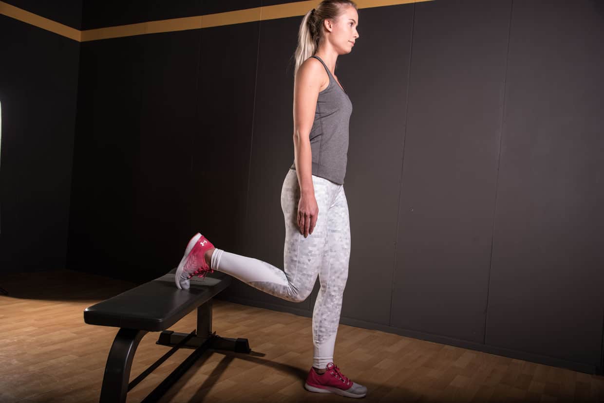 - Begin de oefening door gecontroleerd te zakken tot de voorste knie een hoek maakt van ongeveer 90 graden. Als het bankje ver genoeg naar achteren staan is de knie op dit punt recht boven de enkel en niet ervoor. Pas de afstand indien nodig aan.