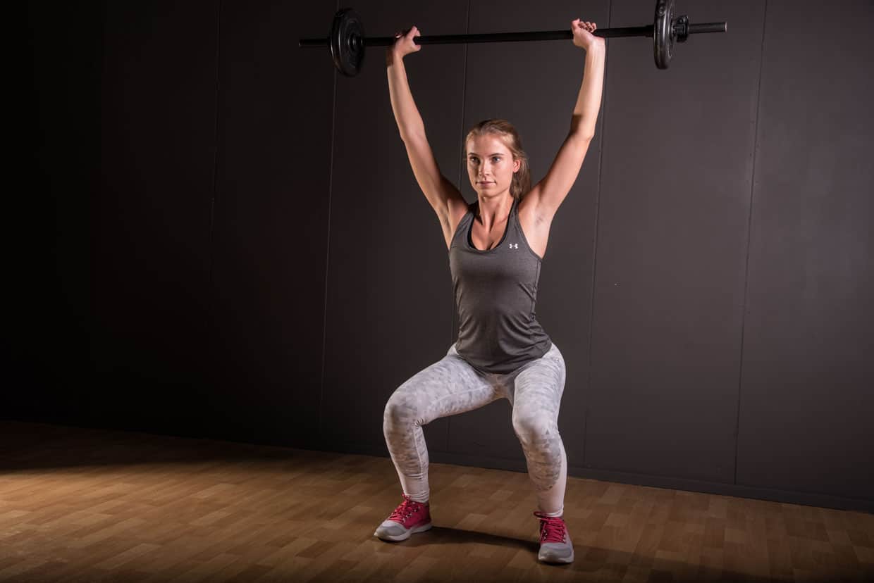 - Stoot de barbell recht omhoog uit om in je start positie te komen.