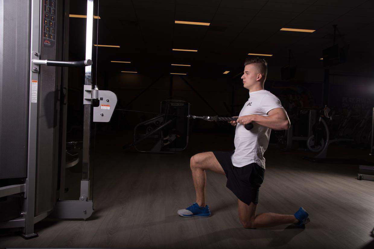- Pak het touw vast met beide handen en ga voor het kabelrek op een knie zitten. Plaats voet en knie breed genoeg (heup- tot schouderbreedte) voor voldoende balans. Zorg dat de afstand tot het kabelrek groot genoeg is om bij gestrekte armen nog spanning te behouden.