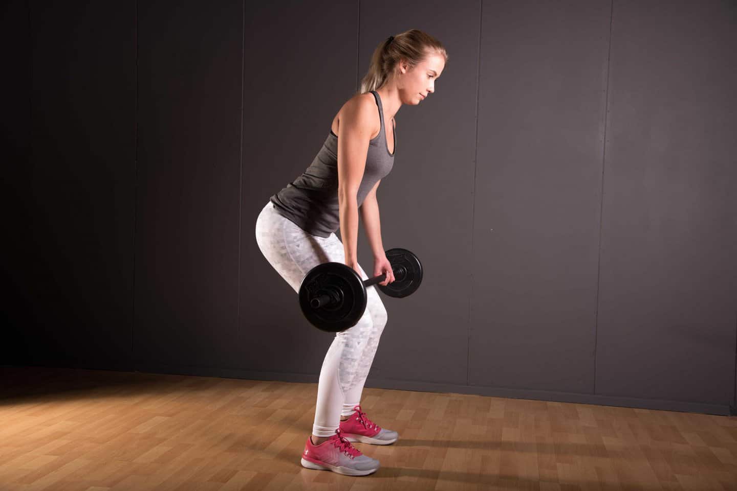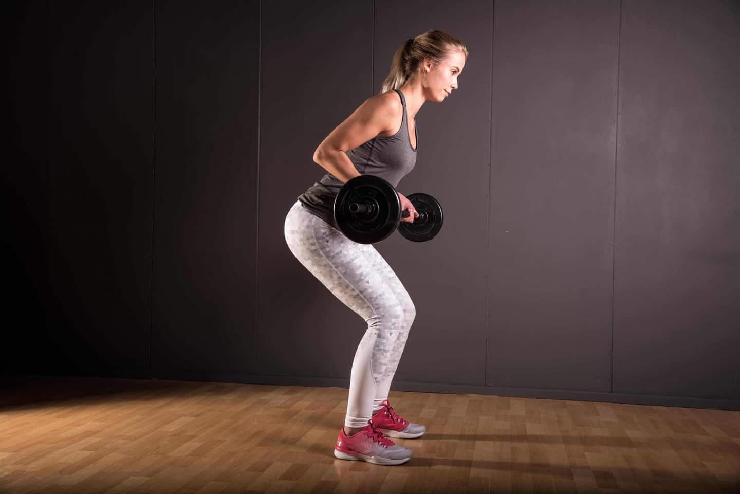 - Begin de oefening door de ellebogen naar en langs je zij te trekken. Laat de barbell daarbij langs je benen glijden, of vlak daarboven.