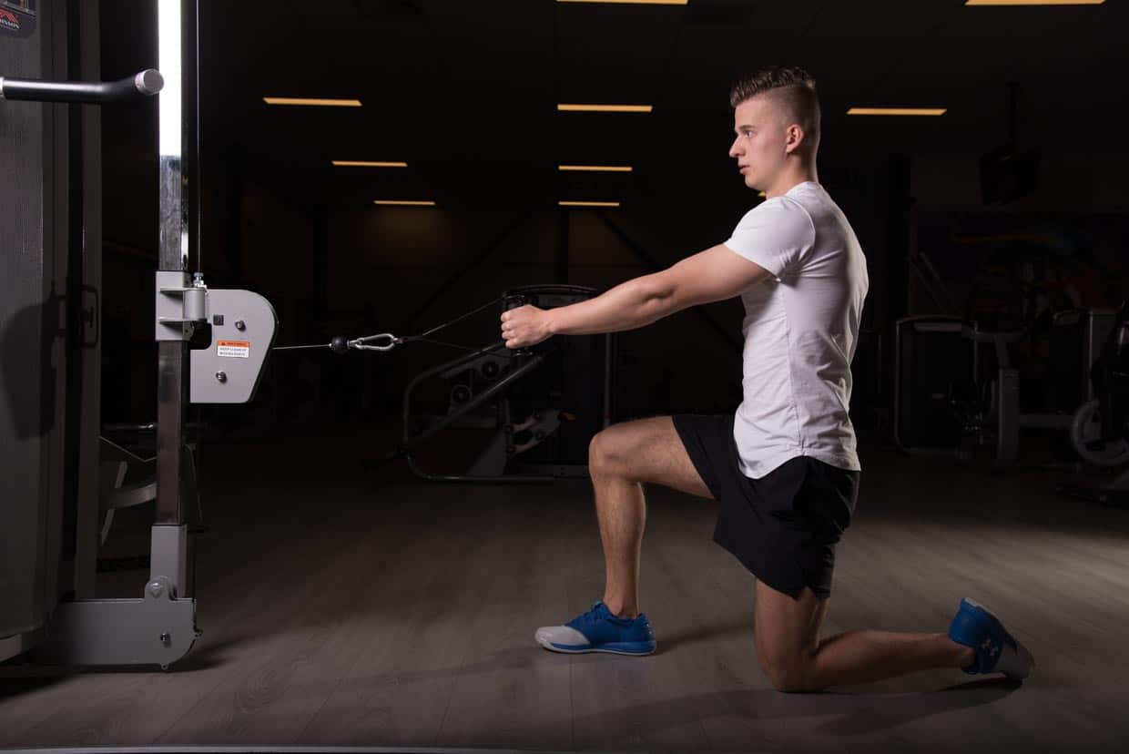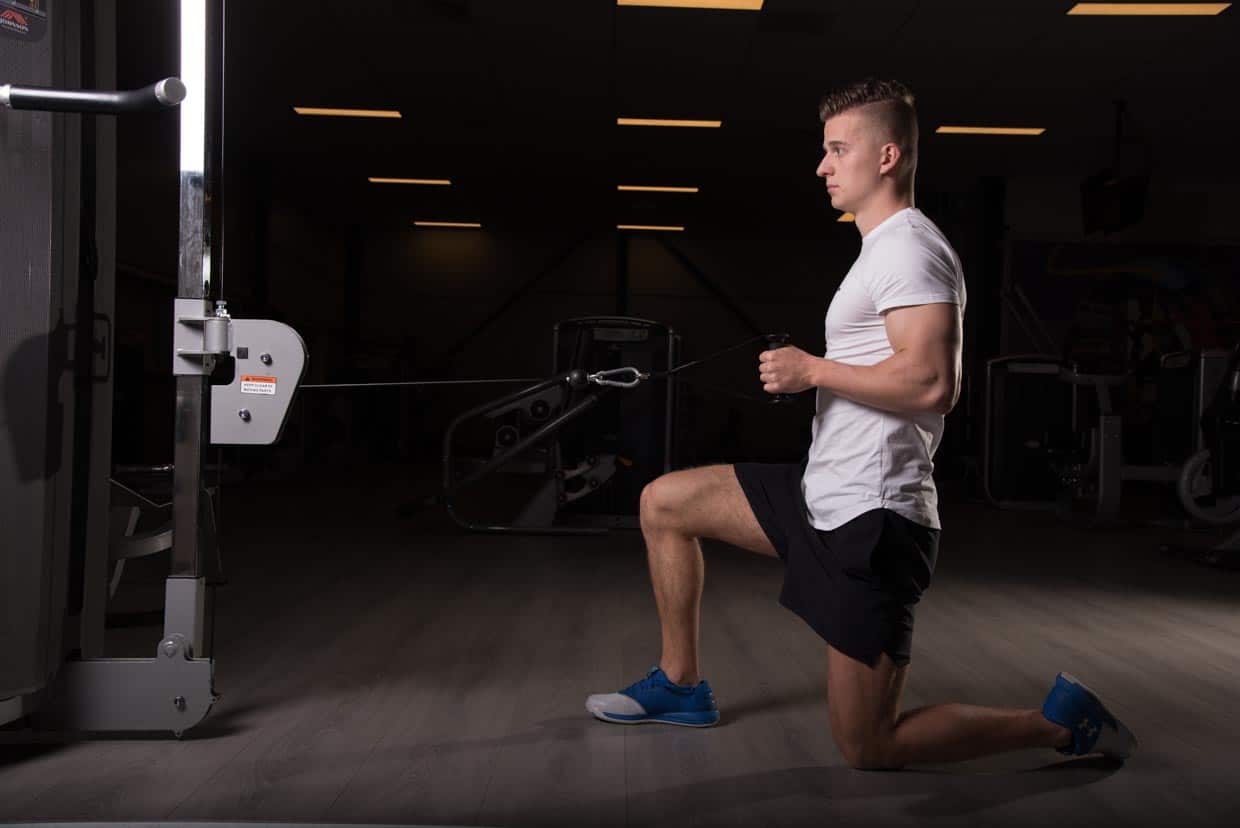 - Pak de handgrepen vast en ga voor het kabelrek op een knie zitten. Plaats voet en knie breed genoeg (heup- tot schouderbreedte) voor voldoende balans. Zorg dat de afstand tot het kabelrek groot genoeg is om bij gestrekte armen nog spanning te behouden.