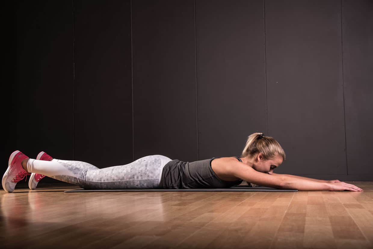 - Ga op met je buik op de vloer liggen.