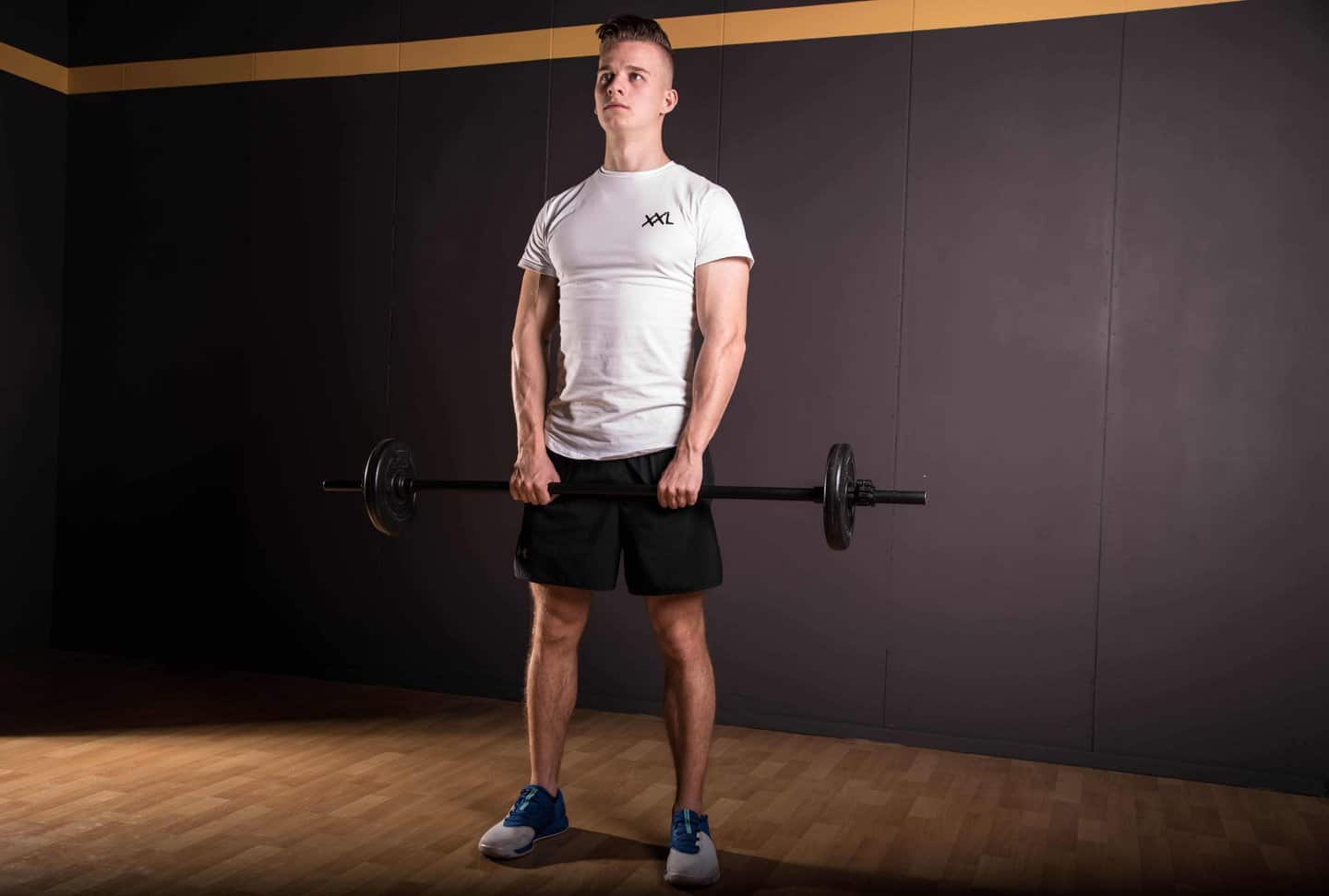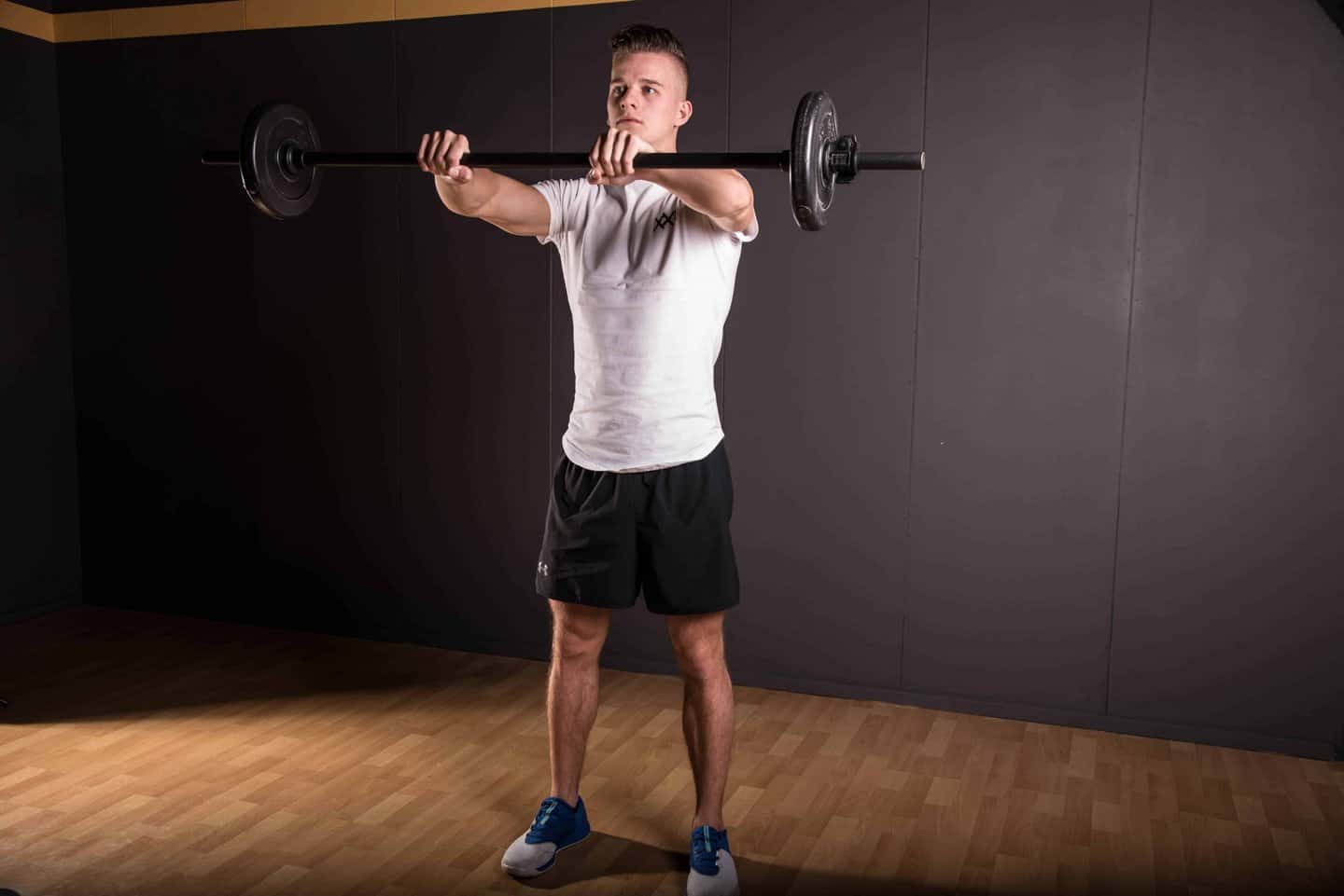 - Hou de barbell vast met de handen op schouderbreedte of iets breder.