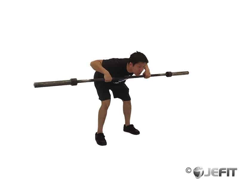 Voorkom ook dat dit een oefening wordt voor de benen, billen en onderrug door deze mee te laten helpen. Probeer dus te zorgen dat alleen je armen en schouders bewegen in deze oefening. Zak niet door de benen bij het laten zakken van het gewicht zodat deze mee kunnen helpen bij het omhoogtrekken. Buig ook niet verder voorover tijdens het laten zakken van het gewicht om vervolgens de bilspieren en onderrug mee te laten werken bij het omhoog trekken.