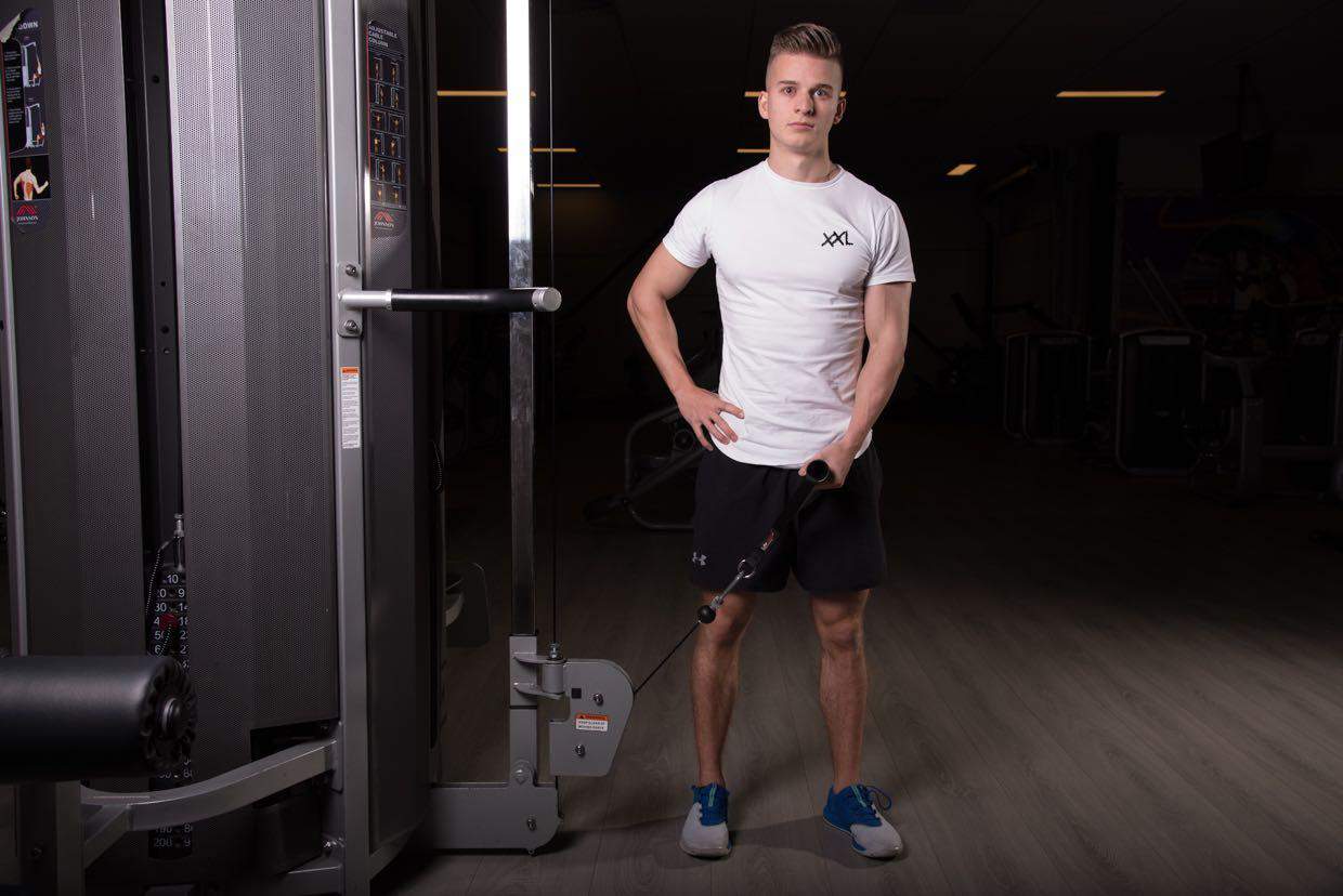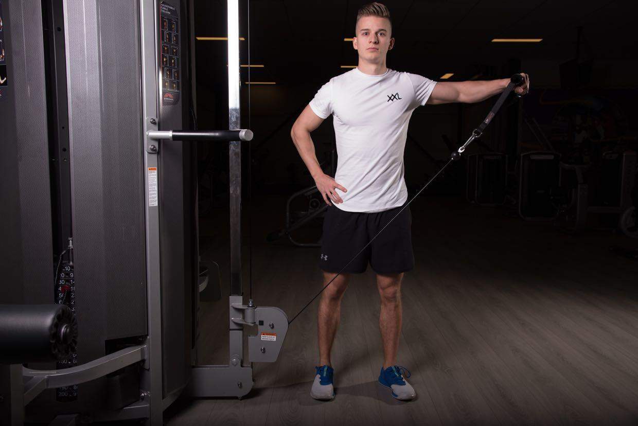 In deze variant worden de lateral raises uitgevoerd met een kabel als weerstand.