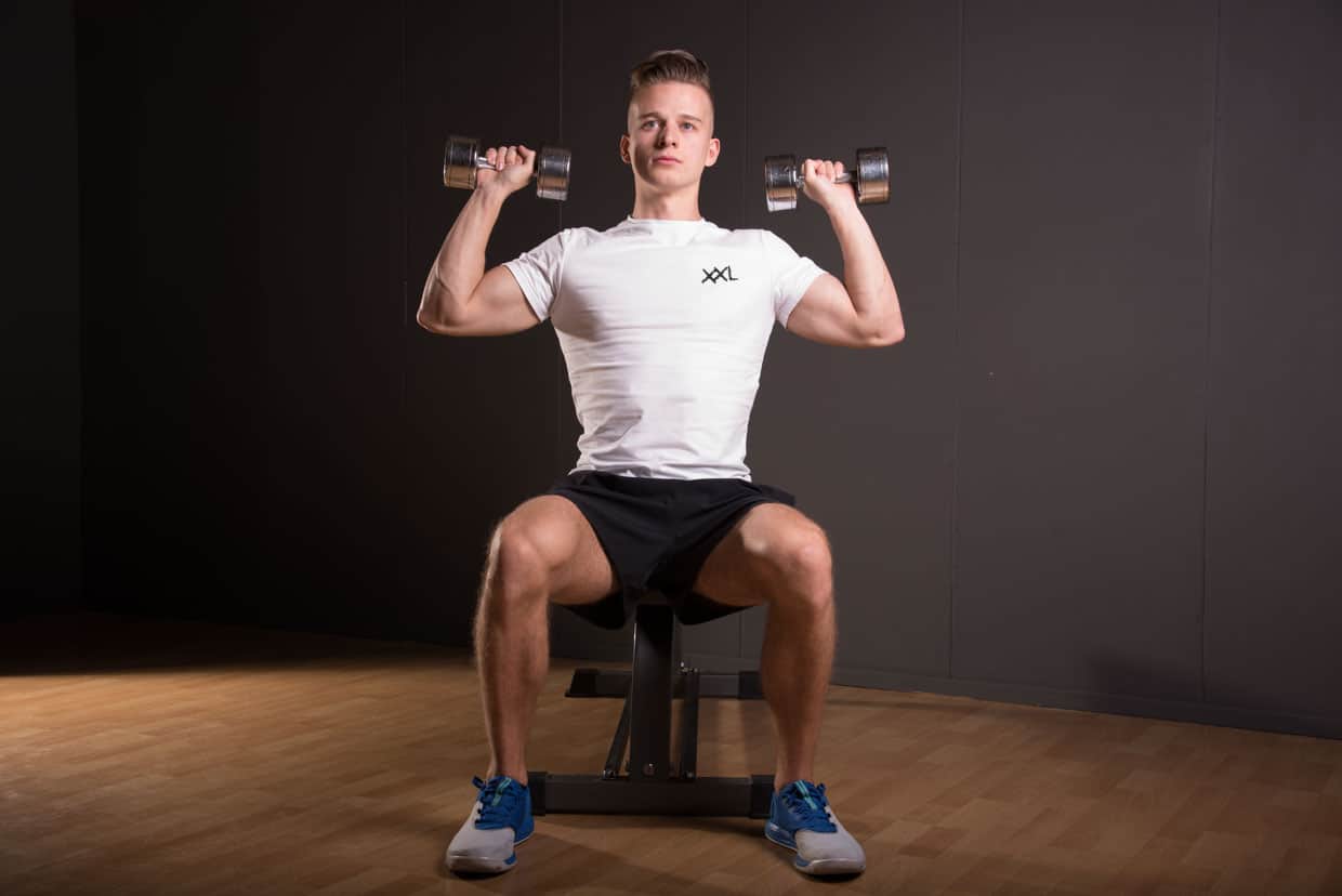 - Duw je billen eventueel weer tegen de rugleuning. Deze kunnen de neiging hebben naar voren te schuiven bij het omhoog brengen van de dumbells. Als je middel te ver naar voren is geschoven dan lig je te ver achterover en nemen de borstspieren een groter deel van de last over van de schouders.