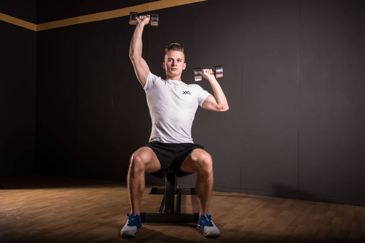 - Concentreer je op de elleboog en duw deze recht naar boven tot voorbij schouderhoogte. De arm is aan het einde van de beweging bijna gestrekt.
