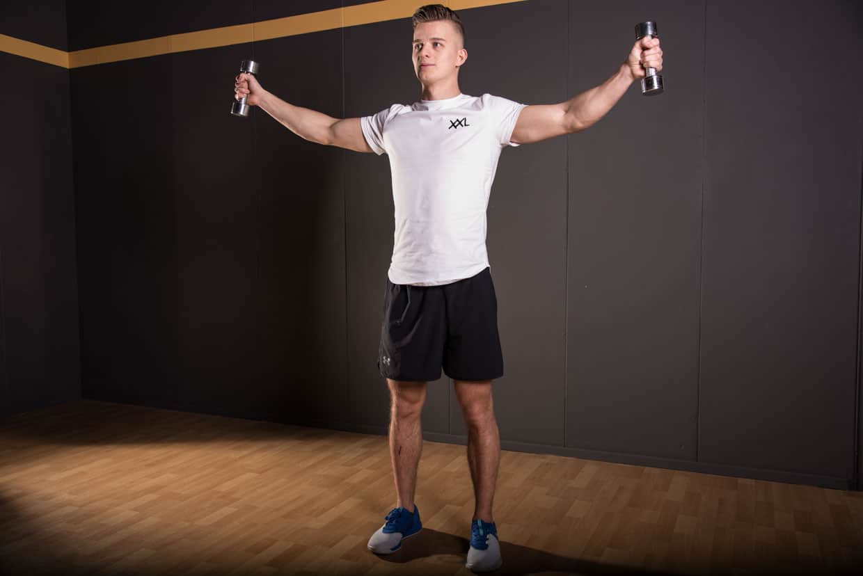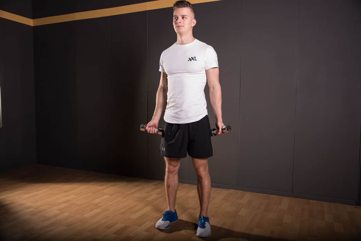 - Ga staan met de (relatief lichte) dumbells in handen. De duimen naar voren gericht, de schouders laag. De armen bijna gestrekt.