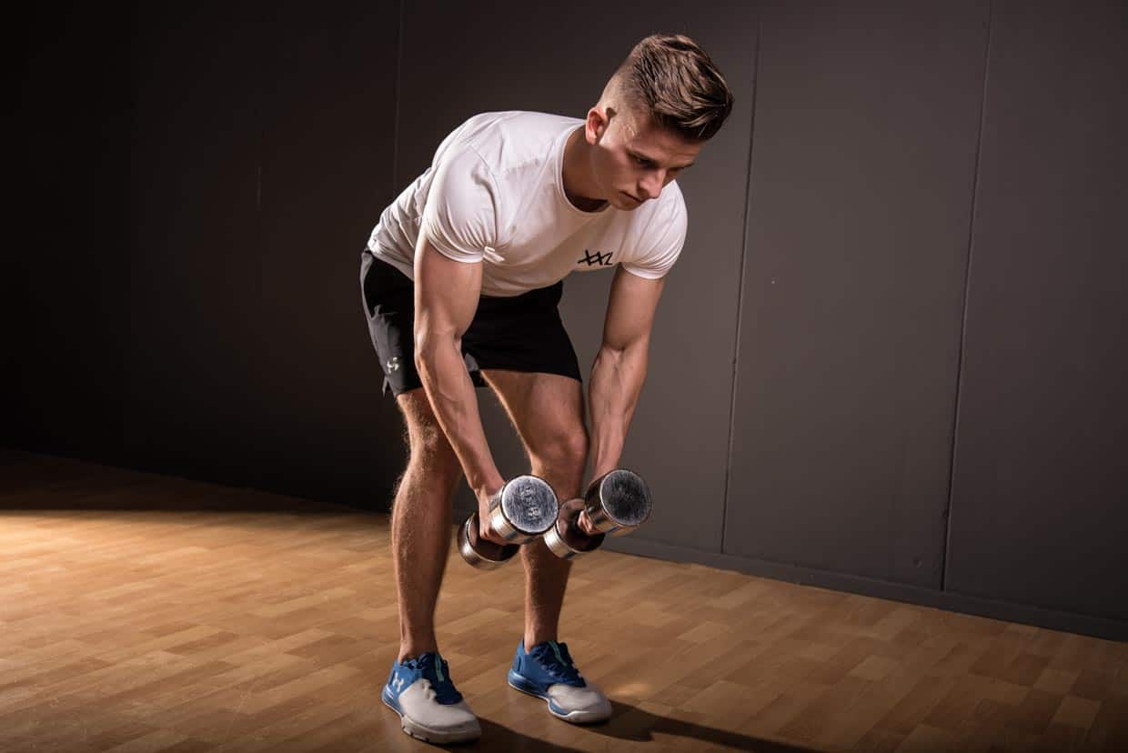 2. Buig voorover naar de startpositie met licht gebogen armen. De benen licht gebogen, de romp in een hoek van ongeveer 90 graden ten opzichte van de bovenbenen.