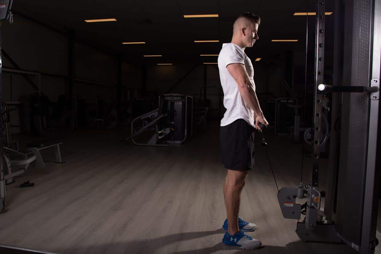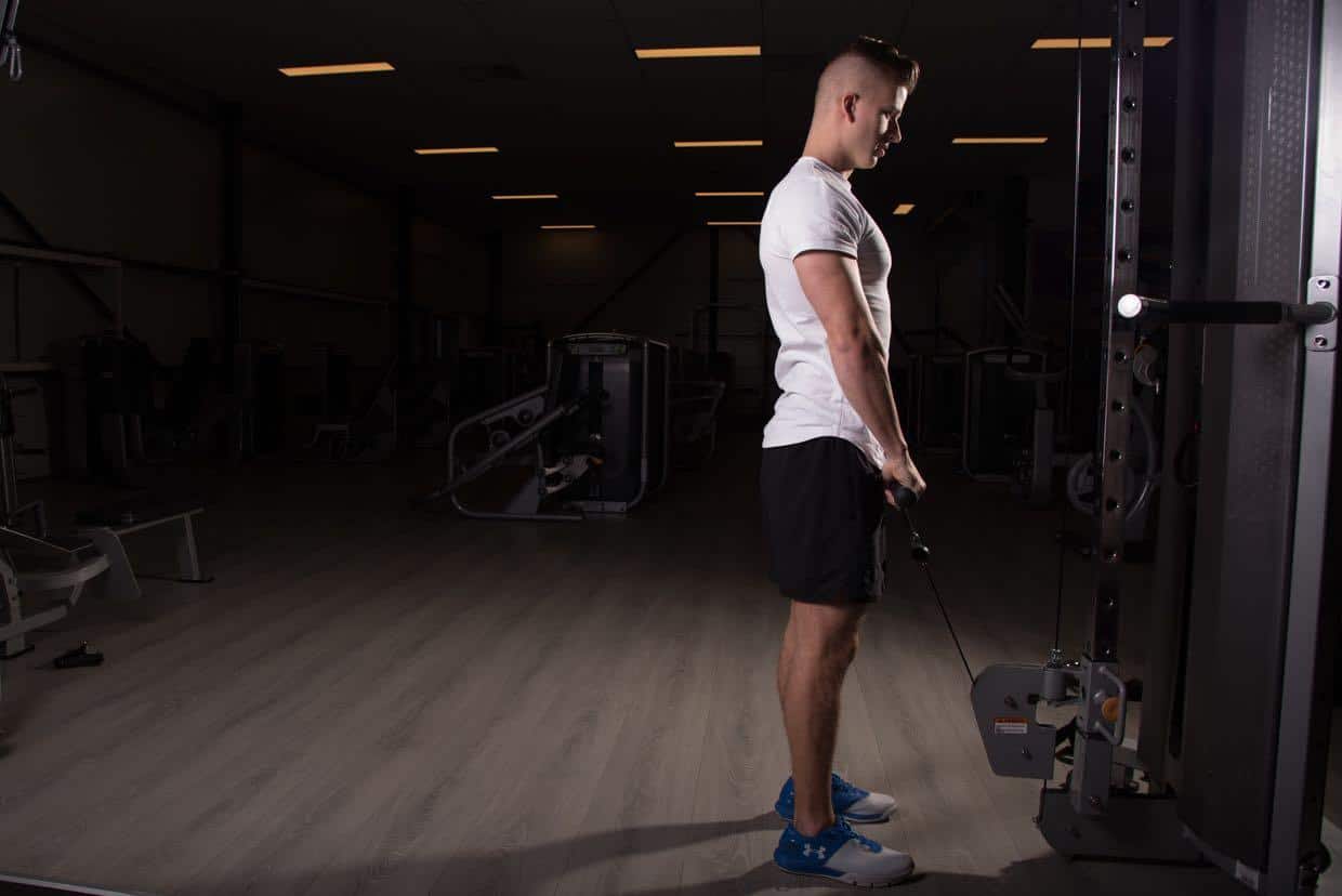 Bij de uitvoering op het kabelrek kan je een extra variabele invoeren. De standaard uitvoering is zo dicht mogelijk op het rek staand. De stang wordt dan zoveel mogelijk recht omhoog getrokken en je richt je vooral op de bovenste vezels.