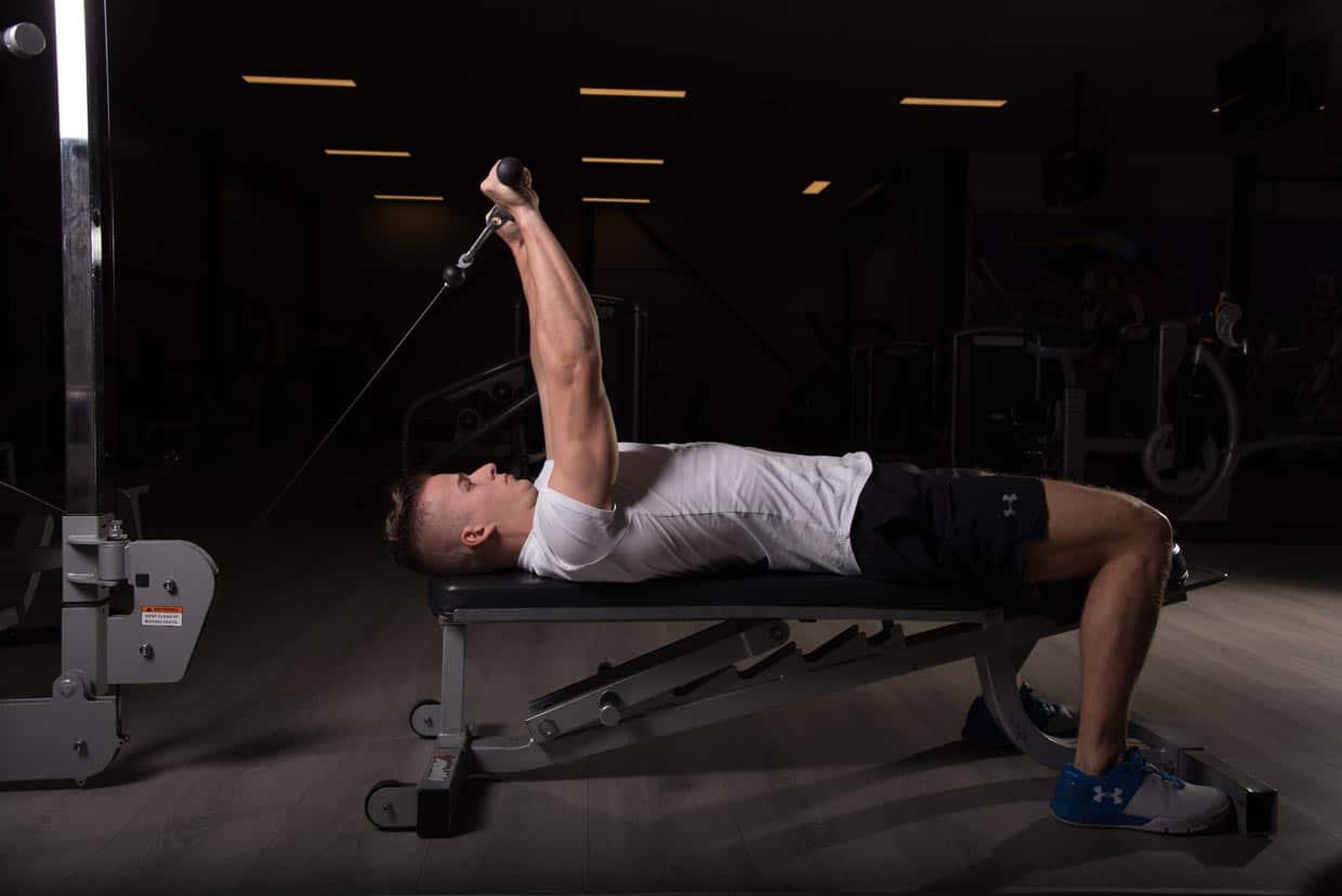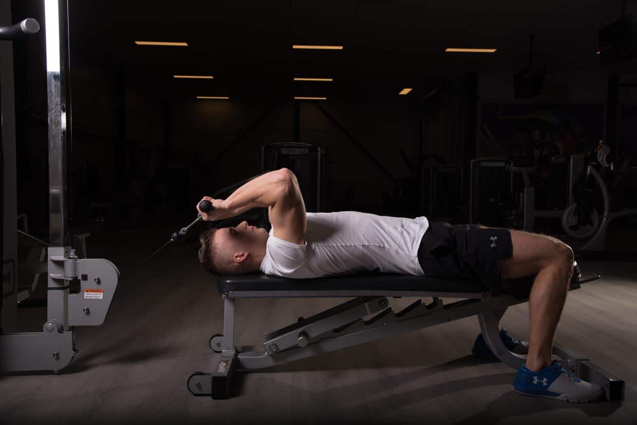 Belangrijk is de juiste afstand van het bankje ten opzichte van het toestel en jouw positie op het bankje. Doel is om zo te liggen dat je er nog net weerstand is wanneer je armen in de gebogen positie van de oefening zitten. Te dichtbij en er is geen spanning meer op de kabel wanneer je armen in de gestrekte positie brengt. Te ver en het wordt moeilijk om in en uit je beginpositie te komen. Een partner die de kabel met stang of touw aangeeft, kan dan ook erg handig zijn.