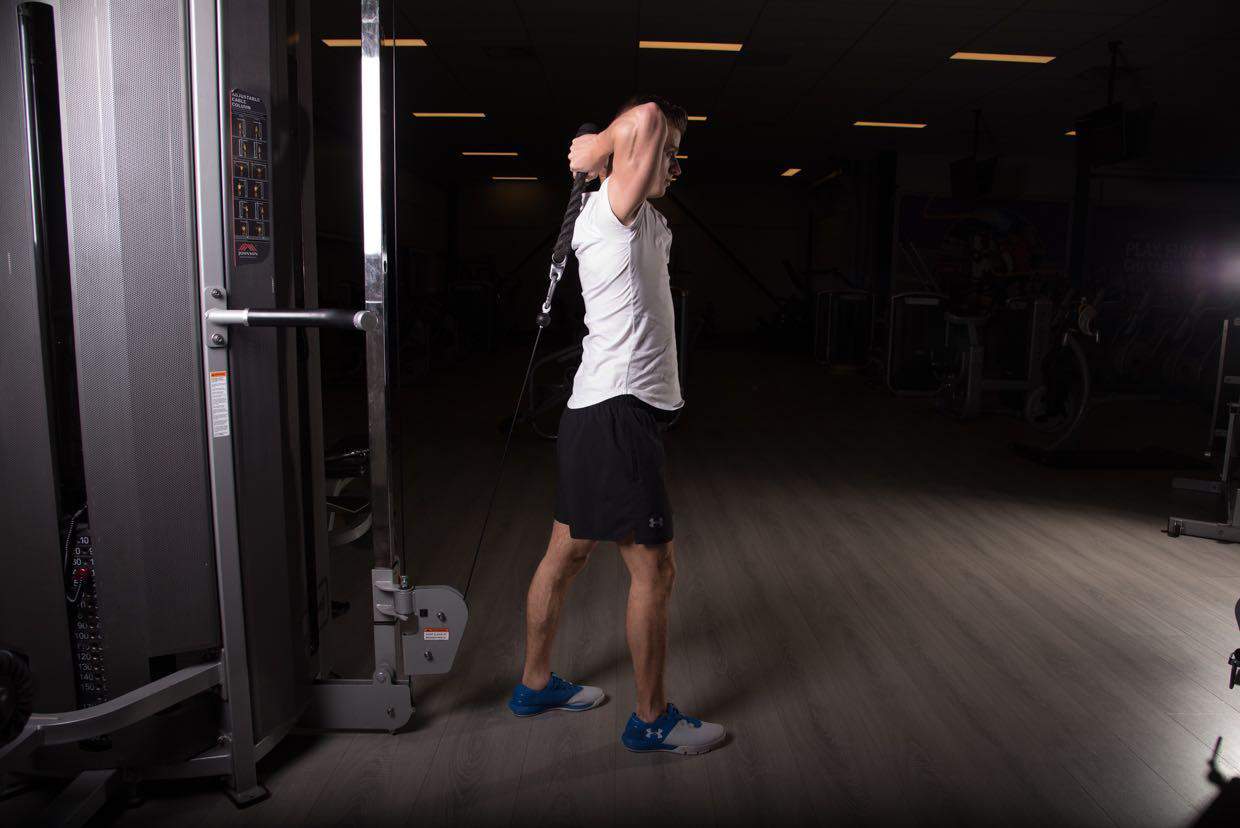 De cable overhead press is een variant op onder andere de cable triceps pushdown en de cable forward triceps extensions. Omdat de weerstand van achteren en onder je komt, worden de bovenarmen omhoog gehouden in plaats van naar voren of onderen. Hierdoor ontstaat er een grotere rek op de (lange kop van de) triceps en verandert de belasting.