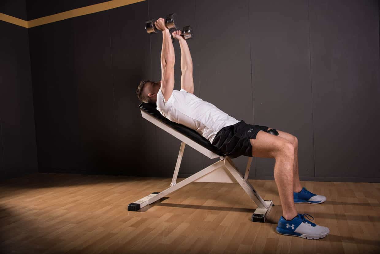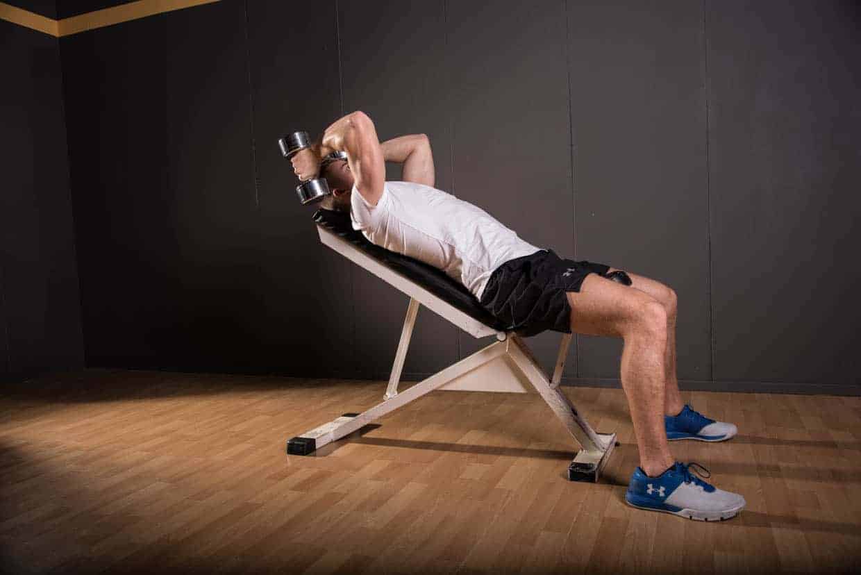 Wanneer je moeite hebt om de ellebogen smal naast het hoofd te houden, dan kun je proberen om de greep bij de dumbbell wat smaller te pakken.
